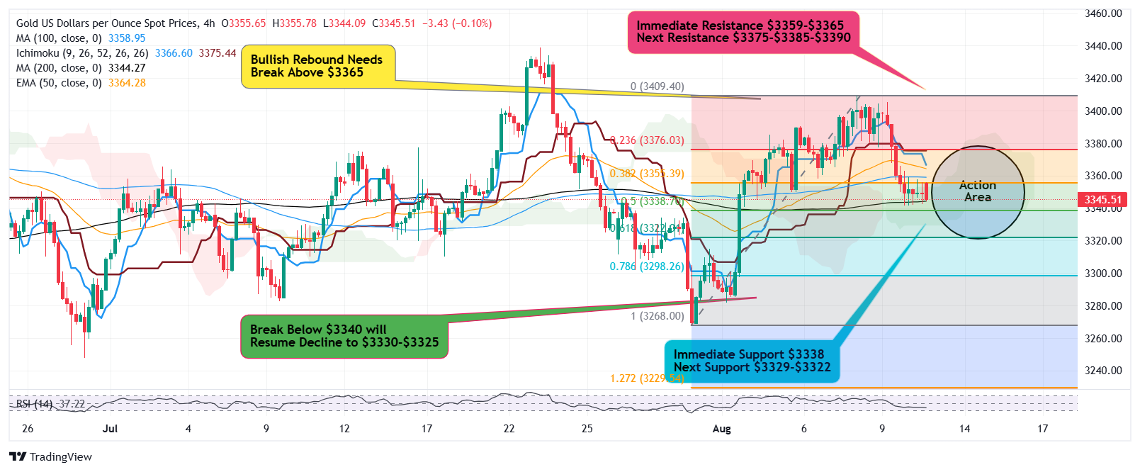 If CPI numbers trigger a Gold rebound, bulls need to clear through immediate hurdle $3359 followed by immediate resistance $3365 which brings next overhead resistance $3375 which is turning point for further acceleration towards next leg higher $3385-$3390 turning short trend bullish.
