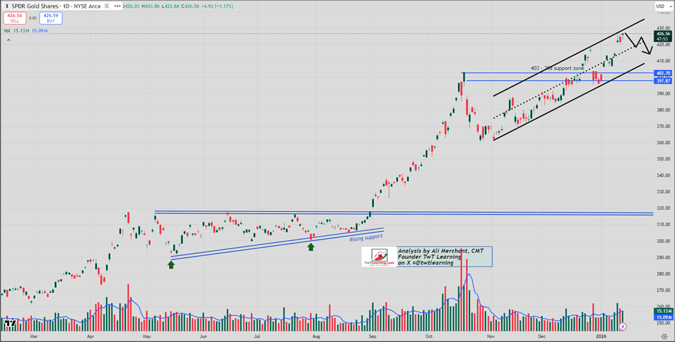 · GLD is testing the top of its rising channel at 428–429.