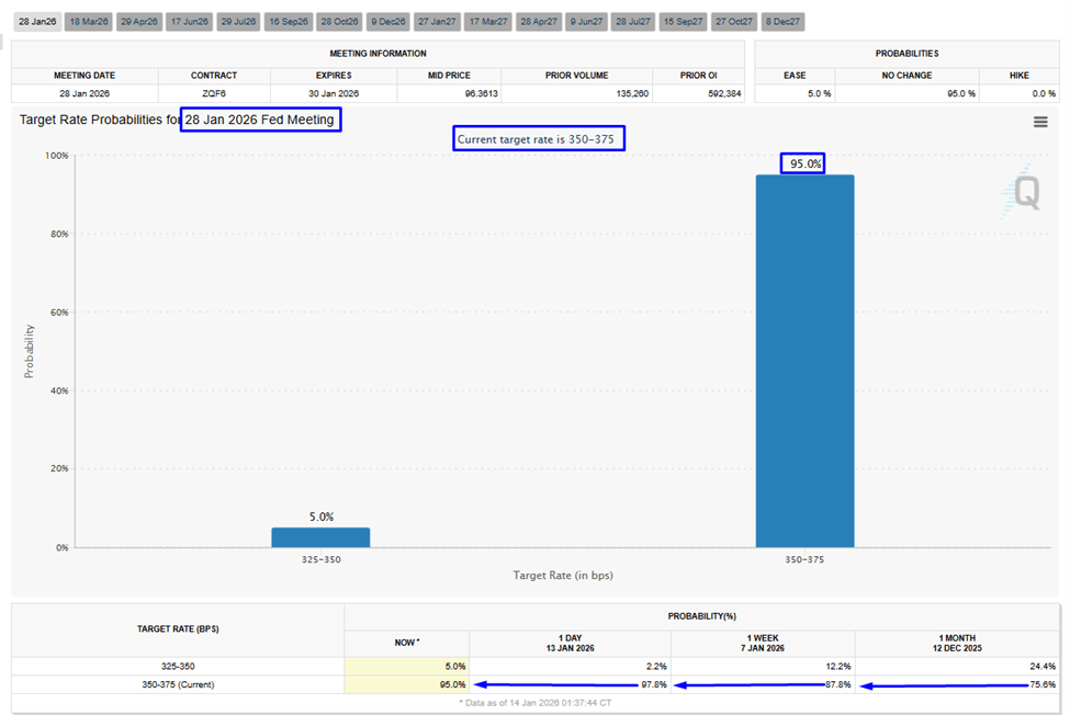 · CME FedWatch January no rate change probabilities have moved higher to 95% today from 75.6% on December 12, 2025.