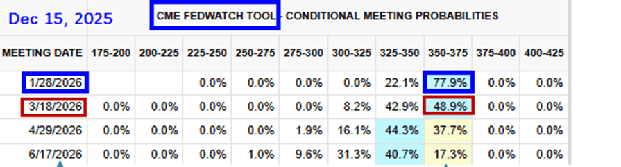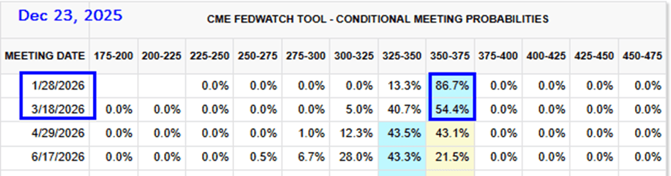 · February rate easing probabilities are at 54.4% today from 48.9% on December 15, 2025.