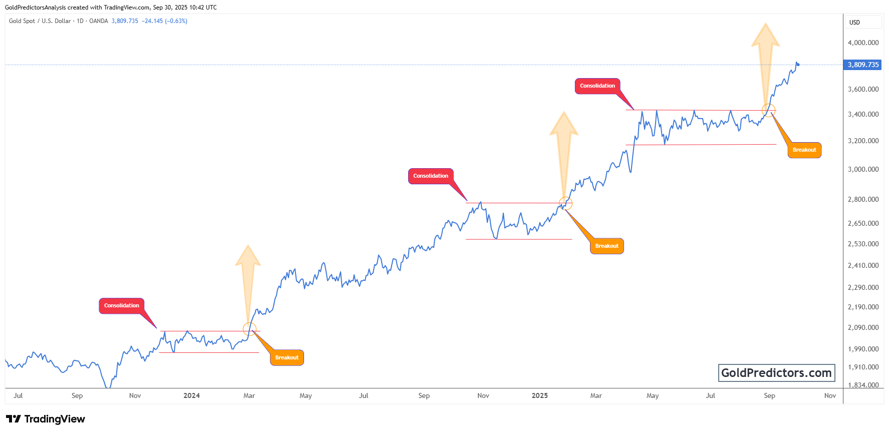In early 2024, gold triggered a breakout from a base near $2,050, sparking a sustained rally that drove prices above $2,600. Subsequently, another consolidation zone formed later in 2024 and resolved with a breakout in early 2025, driving gold toward $3,200. Most recently, gold consolidated between $3,000 and $3,400 for several months before breaking resistance and pushing higher. Ultimately, the breakout signalled renewed strength and carried the metal beyond $3,800.