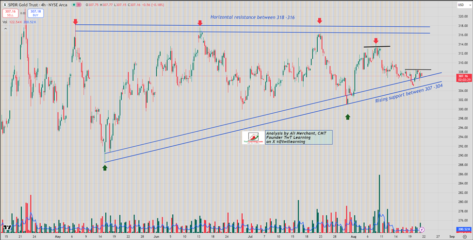- GLD is retesting the rising trendline support from the May 2025 low of 288.50, currently trading between 307 and 304.