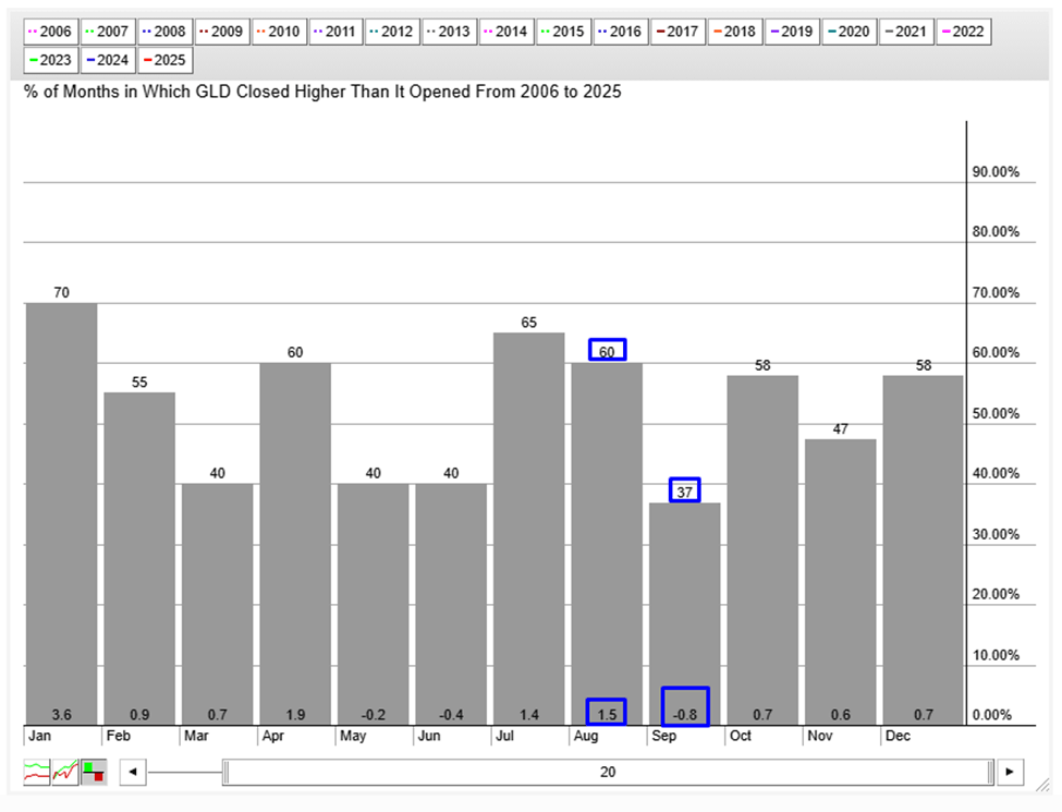 Since 2006, GLD has posted an August gain of 1.5% in 60% of the years, while September has seen a decline of 0.80% in 37% of the years.