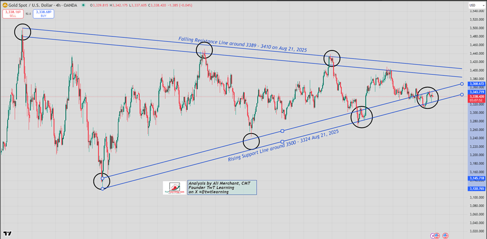 - Support is provided by an upward-trending line around the 3,325 zone.