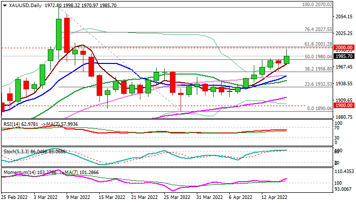 Fresh acceleration higher emerges after a brief pause on Friday, with break of $1980 (50% retracement) confirming a higher base at $1890 zone (lows of the pullback from $2070 peak (2022 peak, posted in March).