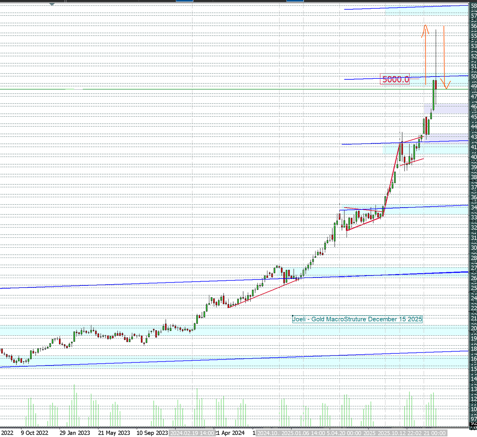 Gold briefly expanded into the new long-term phase before rotating back below 5,000, shifting focus to how price responds within the lower structure.