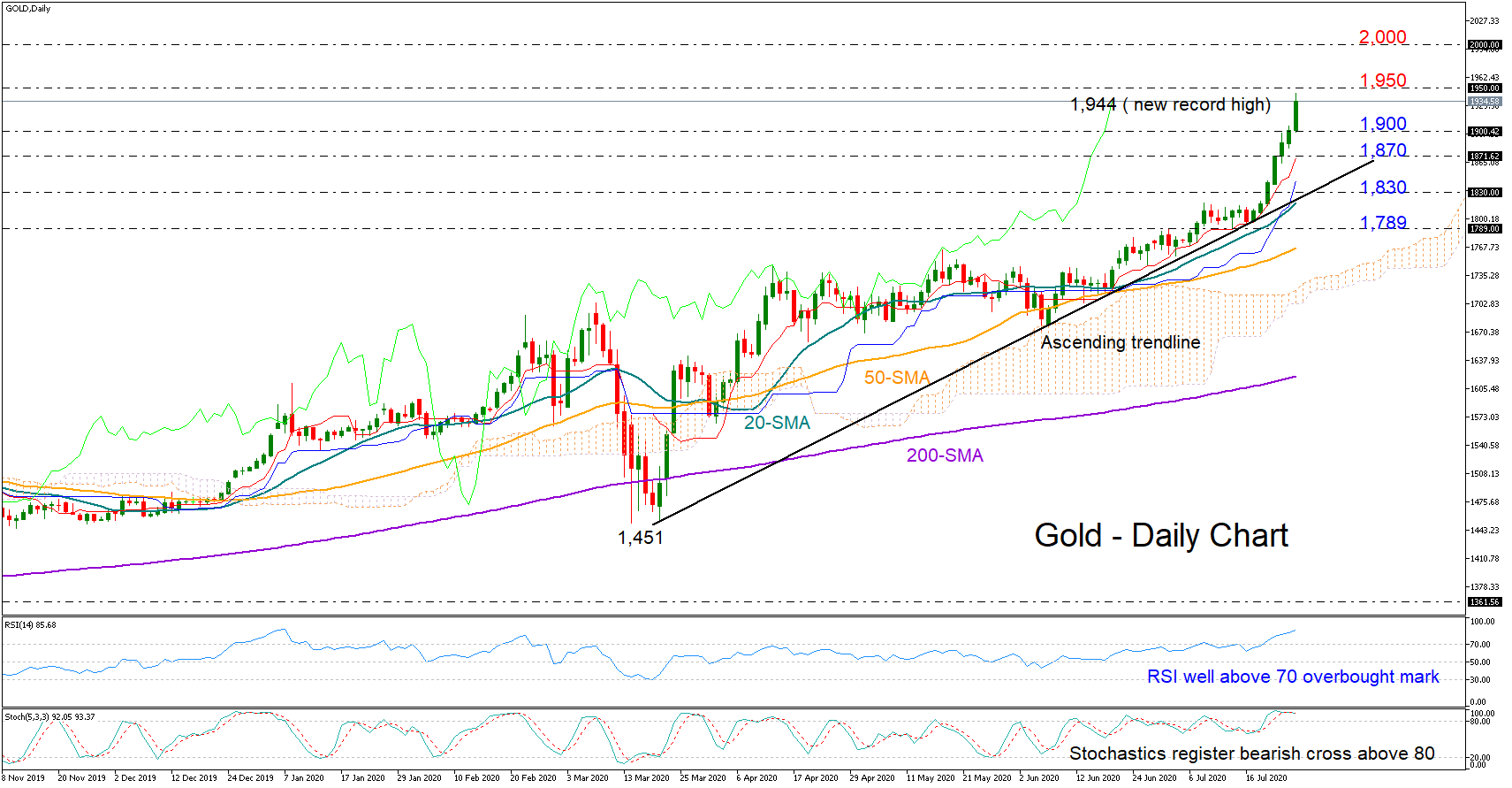 Gold stretched its unstoppable rally to uncharted territory on Monday and to a new top of 1,944 after easily surpassing the 2011 record high of 1,920.