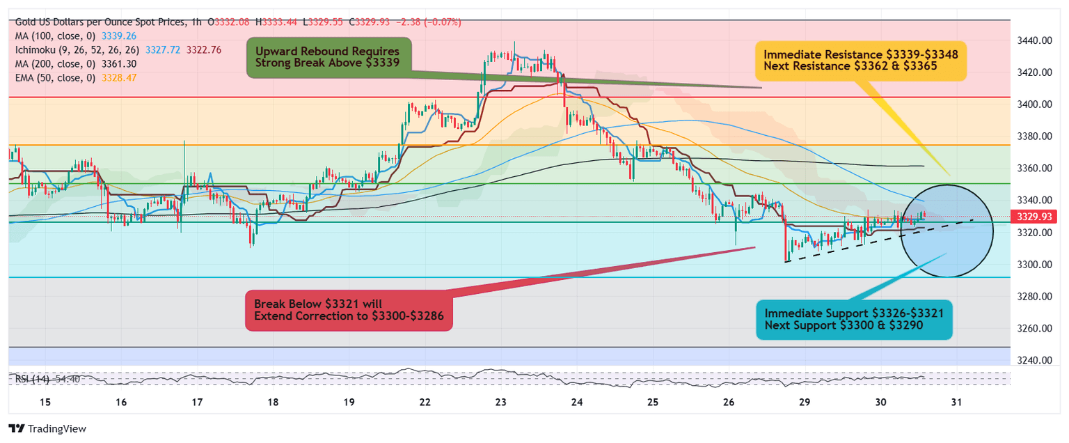 The recent sell off in Gold from $3439 reached psychological zone $3300 but rebound attempts lack strong conviction and immediate resistance sits at $3339 which bulls need to clear and further reclaim next hurdle at $3350 to establish a decisive rebound that initially targets $3365.