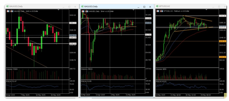Gold, Silver, and Platinum price dynamics (March-May 2025). Source: MT4