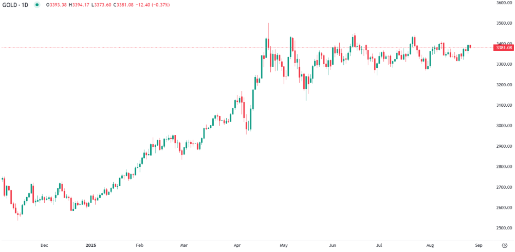 Gold prices fell in early Wednesday trading, giving back some of the previous session’s gains. The losses were driven by profit-taking after bullion hit a two-week high on Tuesday, as well as by a modest rebound in the US dollar. However, downside pressure on gold appears limited by the US administration’s attempt to dismiss Federal Reserve governor Lisa Cook — a move many view as political interference that could undermine the central bank’s independence and weaken the dollar’s appeal. This dynamic is supportive for gold, given its inverse correlation with the US currency. Against this backdrop, traders will closely monitor developments in Washington while awaiting key US economic data — Thursday’s GDP figures and Friday’s PCE inflation release. Both are important events in the economic calendar that could influence investor sentiment and Fed rate-cut expectations, with potential implications for gold’s performance. Another focal point will be Nvidia’s earnings, due late on Wednesday. As the world’s largest company by market capitalisation and the main driver of US stock market gains this year, any disappointment in its results could dent risk appetite, trigger profit-taking, and increase flows into safe-haven assets — potentially creating fresh upside for gold.