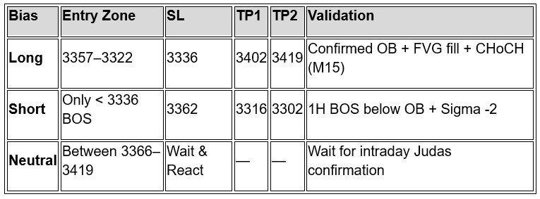 - Buy dips into 3347–3358, contingent on bullish OB + filled FVG and CHoCH confirmation on M15/M5.