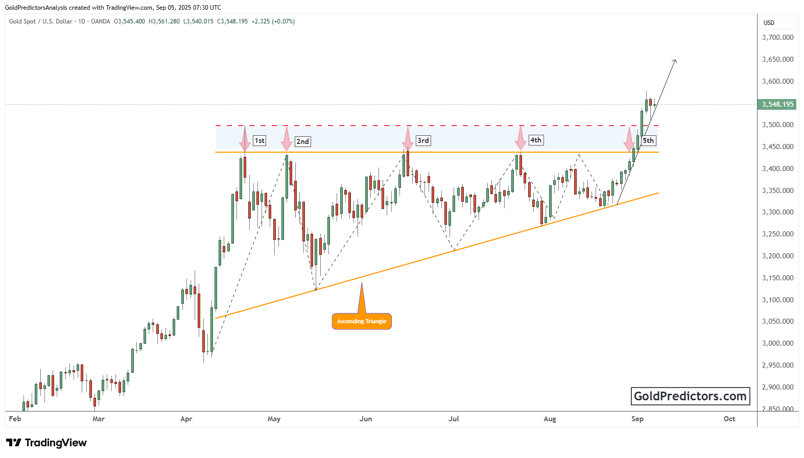 The rising trendline signals increasing demand and steady accumulation by buyers. As price compressed between the rising lows and static resistance, breakout potential increased. Eventually, gold broke above $3,500 in early September 2025 after multiple failed attempts, with the fifth test proving successful. The breakout gained immediate traction, fueling a sustained rally and validating the technical formation. The breakout zone now acts as key support.