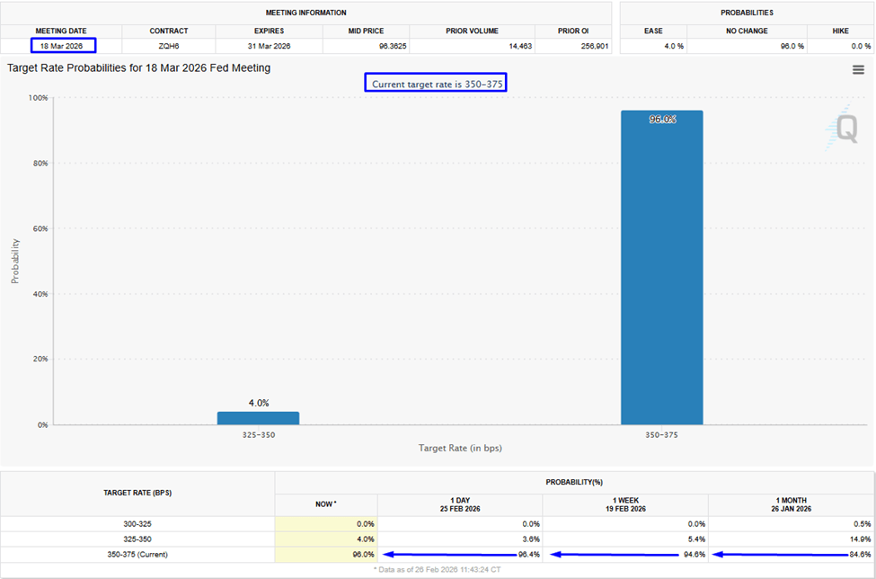 · CME FedWatch March no rate change probabilities have moved higher to 96% today from 84.6% on January 26, 2025.