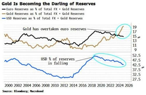 Central banks aren’t just watching from the sidelines—they’re quietly rewriting the playbook. Gold reserves now exceed euro holdings by the widest margin on record. And this isn’t just a valuation quirk driven by price—this is real volume. Over 36,000 tons now sit in vaults globally, the most since the mid-1970s.