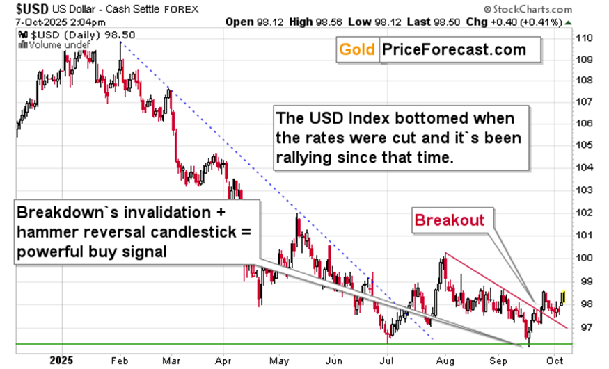 Yes, the U.S. dollar moved higher after verifying its short-term breakout, which itself happened after it verified its medium-term breakout, and it’s all happening while the USD Index is universally hated, Fed started to cut rates, and the employment numbers are not being published due to U.S. government shutdown. It seems that the USD is able to rally despite everything being thrown at it.