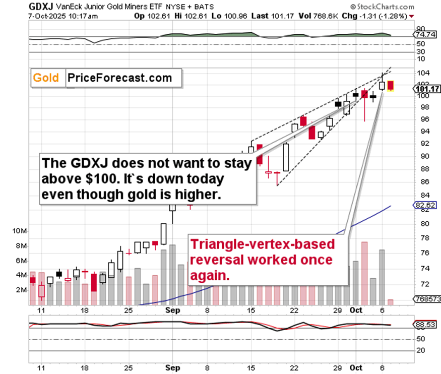 Exactly. The GDXJ ETF, proxy for junior and mid-tier gold/silver miners looks like it’s done rallying, and its move above $100 will be invalidated shortly.