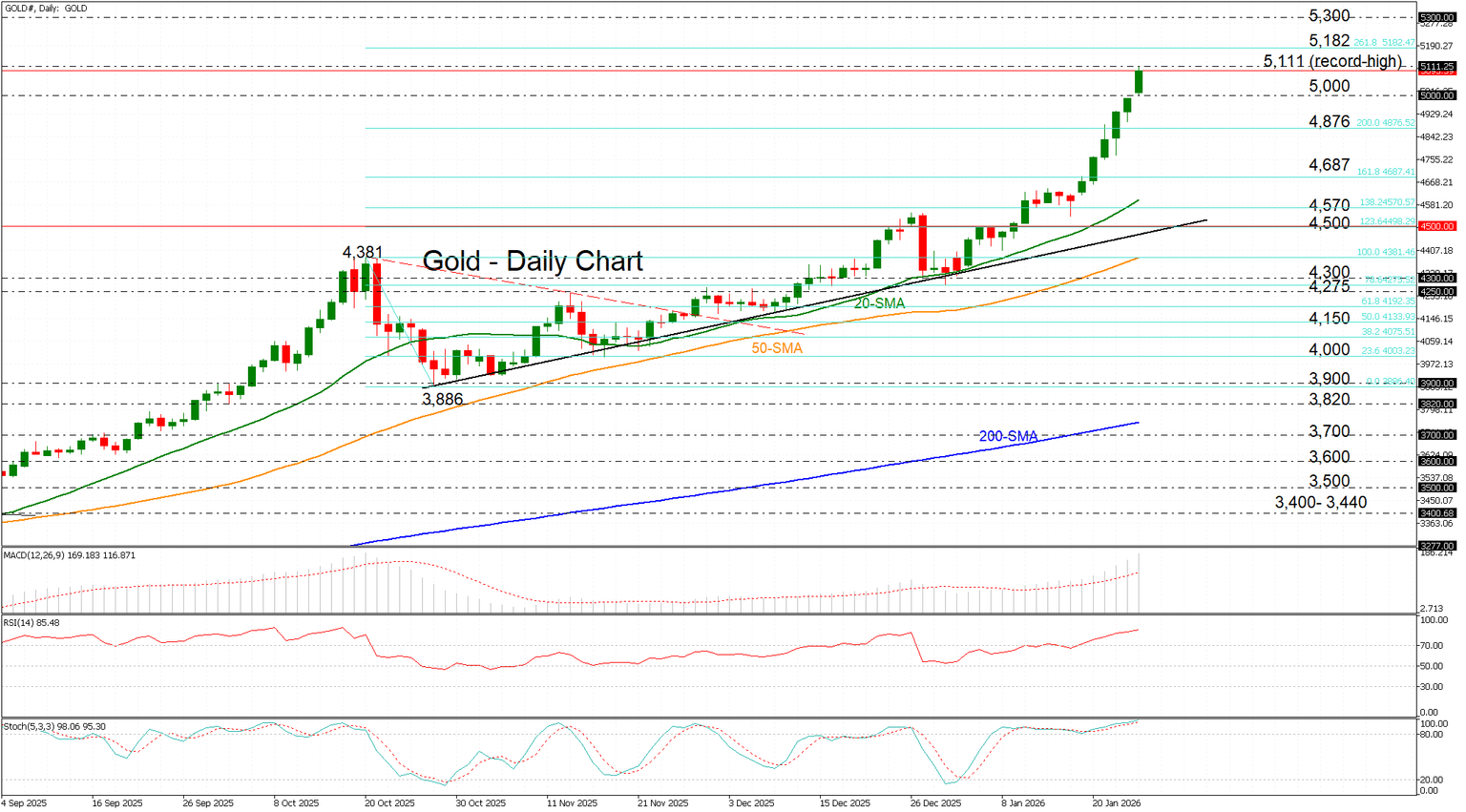 Gold is extending last week’s historic rally – its strongest weekly advance since the 2008 global financial crisis – as investors continue to flock to the safe‑haven metal amid intensifying geopolitical turmoil. After decisively clearing the 5,000 milestone and reaching a new record near 5,111, further upside appears likely, with both fundamentals and technicals supporting the move.