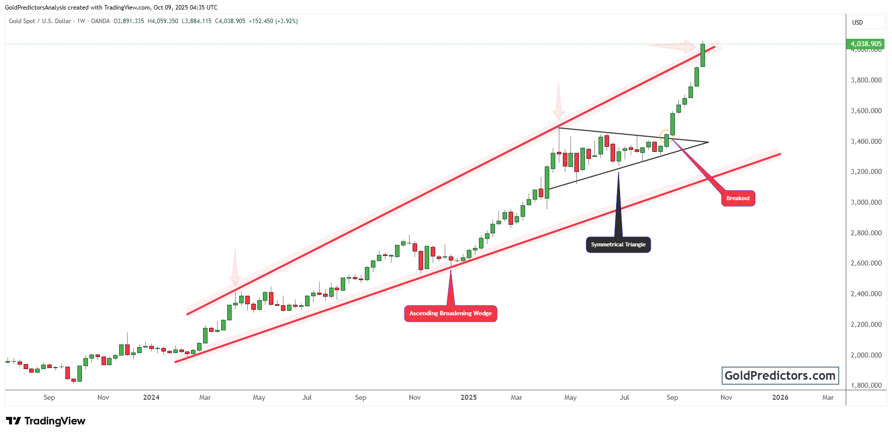 In mid-2025, gold entered a symmetrical triangle pattern, signaling short-term consolidation after the previous rally. The structure represented temporary indecision but ultimately acted as a continuation pattern. A clean breakout above the $3,400 level confirmed the bullish trend and triggered a sharp rally, propelling gold toward the $4,000 area.