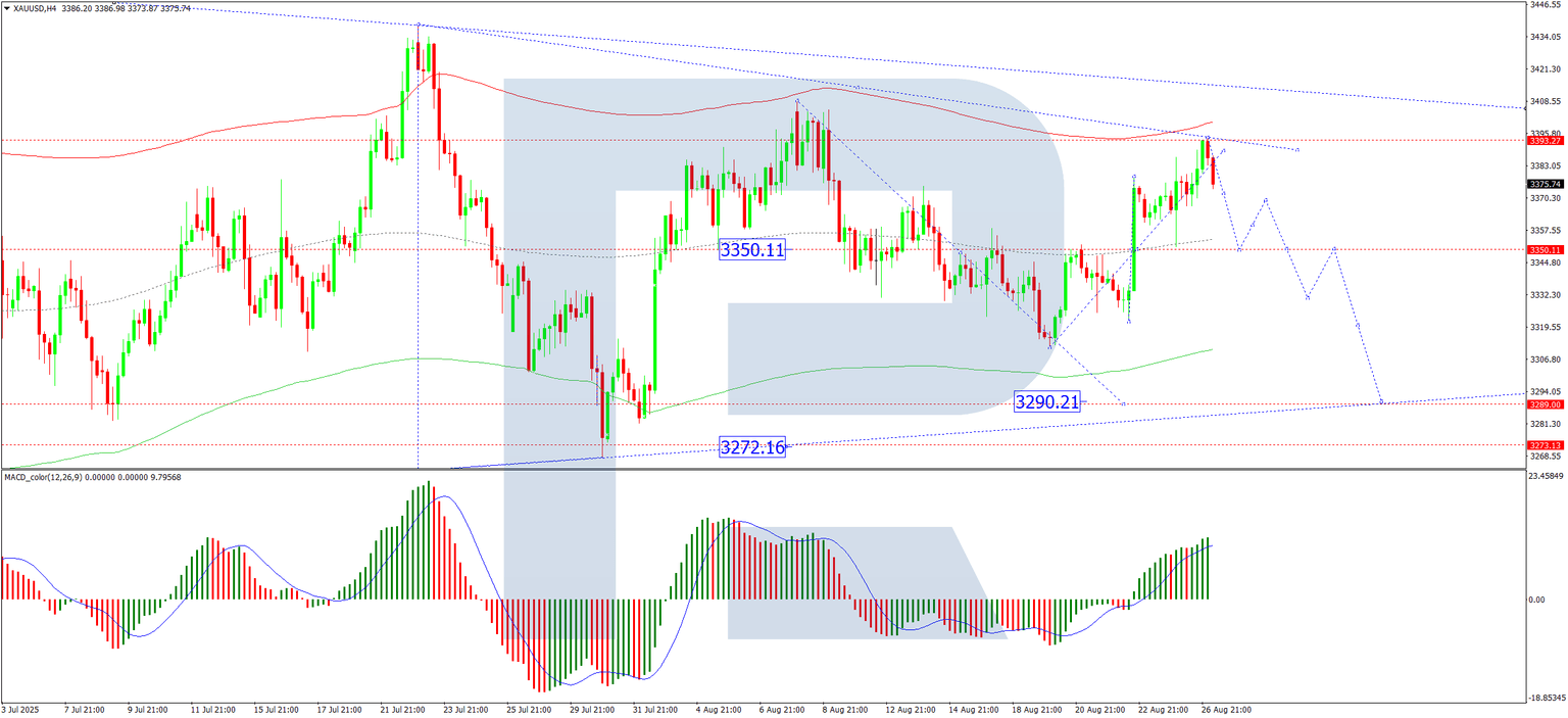 The XAU/USD pair on the H4 chart completed an upward wave towards the 3,393 USD level. The focus now shifts to the potential for a decline to the 3,350 USD support level. The market appears to be consolidating within a broad range around this point. A decisive break below this range would open the potential for a further downward wave towards 3,290 USD.