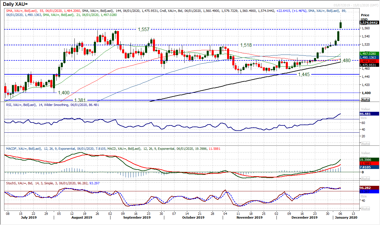 The drive higher on gold over the festive period was given rocket boosters on Friday’s geopolitical news. The market has paid scant regard for the 2019 high of $1557, gapping through the resistance to a new high dating back to 2013. The market has been on a big bull run ever since the breakout above $1480 and has shown little sign of stopping. However, the one caveat is that the market is increasingly stretched. Gold is trading entirely outside the 2.0 SD Bollinger Bands today (the upper band is at $1556 currently). Furthermore, the RSI is into the high 80s now which is becoming extremely stretched. These conditions show the bull run is extremely strong, but excessive too. Care must be taken with chasing gold higher in this situation. Profit-taking is increasingly possible now. There is a gap at $1553 from Friday’s high, whilst $1557 is the old key high which is also a basis of support now. The next resistance is $1600 (psychological) and minor at $1616 (March 2013 high, but is little realistic resistance.
