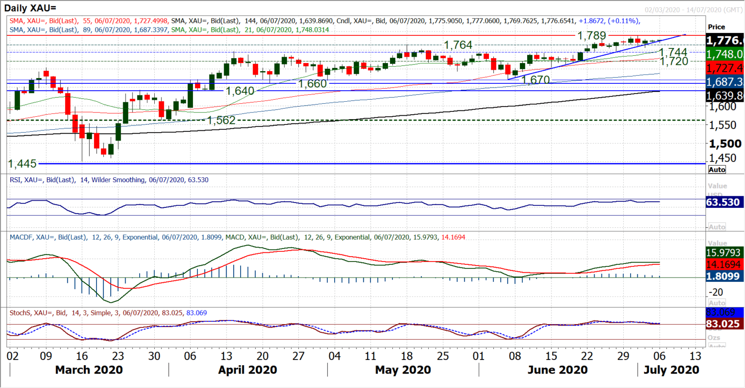 Anyone trading gold on Friday may just as well have gone back to bed, as the market completed the smallest daily range (just $5) of 2020. Last week we focused on the four week uptrend, which had been briefly breached by the Nonfarm Payrolls volatility but essentially remained intact. This support of the uptrend could well be broken simply by consolidation this week. What this does mean is that the bulls who have been driving the market to new multi-year highs last week, are just taking a breather. The question is whether this turns into a near term slip or is the precursor to the next leg higher. Support in the band $1757/$1764 will determine this. A closing breach of $1764 could see a drift back towards $1744/$1747 which is the next area of old breakout support. Momentum in the run higher is just beginning to tail off slightly, but for now retains its positive configuration (with daily RSI above 60 and Stochastics above 80). Trading above $1764 we are still bullish on the near term prospects of gold to push above $1789 and into the $1800s (an upside implied target for the next few weeks can be derived around $1820). Below $1764 we look to use supported weakness towards $1744 as a chance to buy.