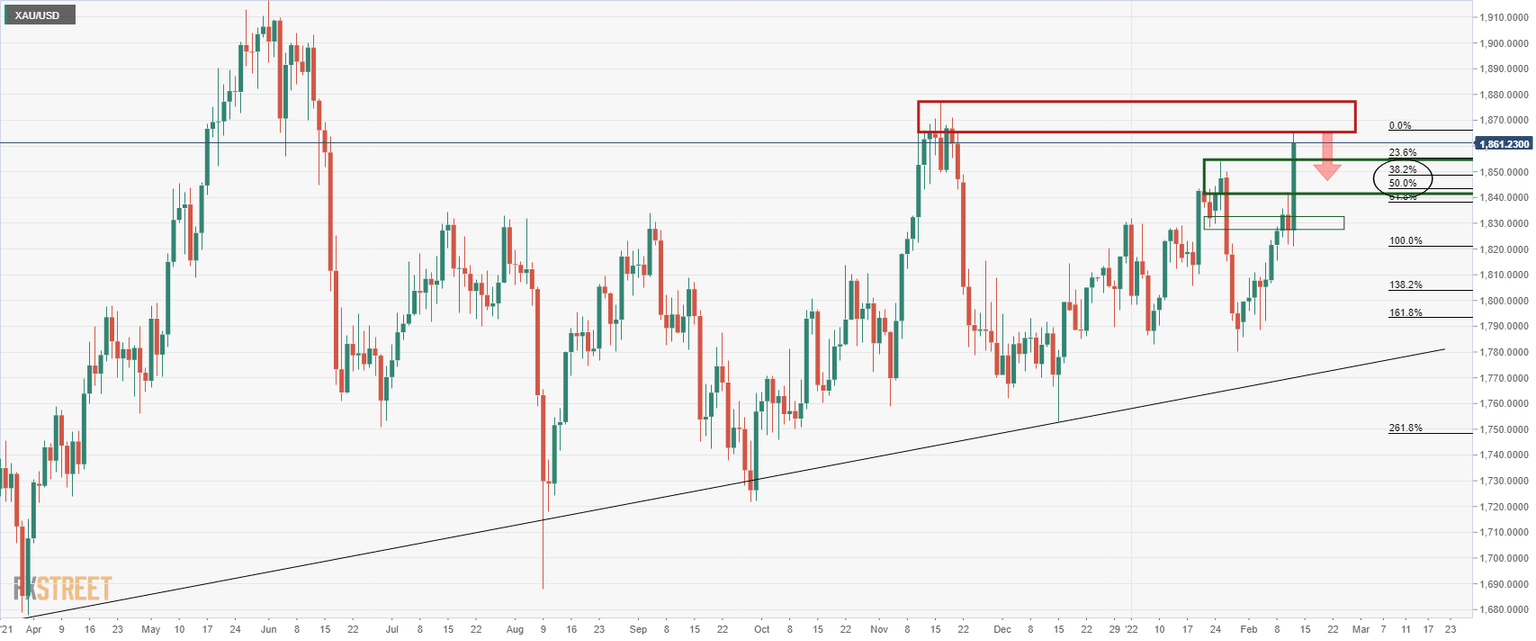 Risk aversion spiked late in the New York session as the US warned its citizens to leave Ukraine within 48 hours due to Russian invasion risks. This sent Wall Street into a tailspin and sent the US 10-year Treasury yields crashing below daily support from 2.061% to a session low of 1.915%. The greenback remained in positive territory in the 96 areas, DXY. However, for its haven allure, gold buyers emerged and the following illustrates past and prospective price action in a top-down analysis.