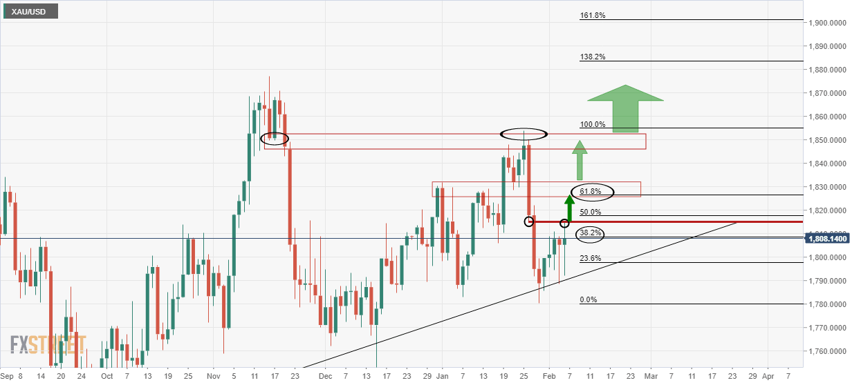 As per last week's analysis, Gold, Chart of the Week: Bulls take on the 38.2% Fibo, now eye the 61.8% golden ratio, the price respected the neckline of the M-formation initially and then the bulls took control again taking the price to a fresh daily high on Friday.
