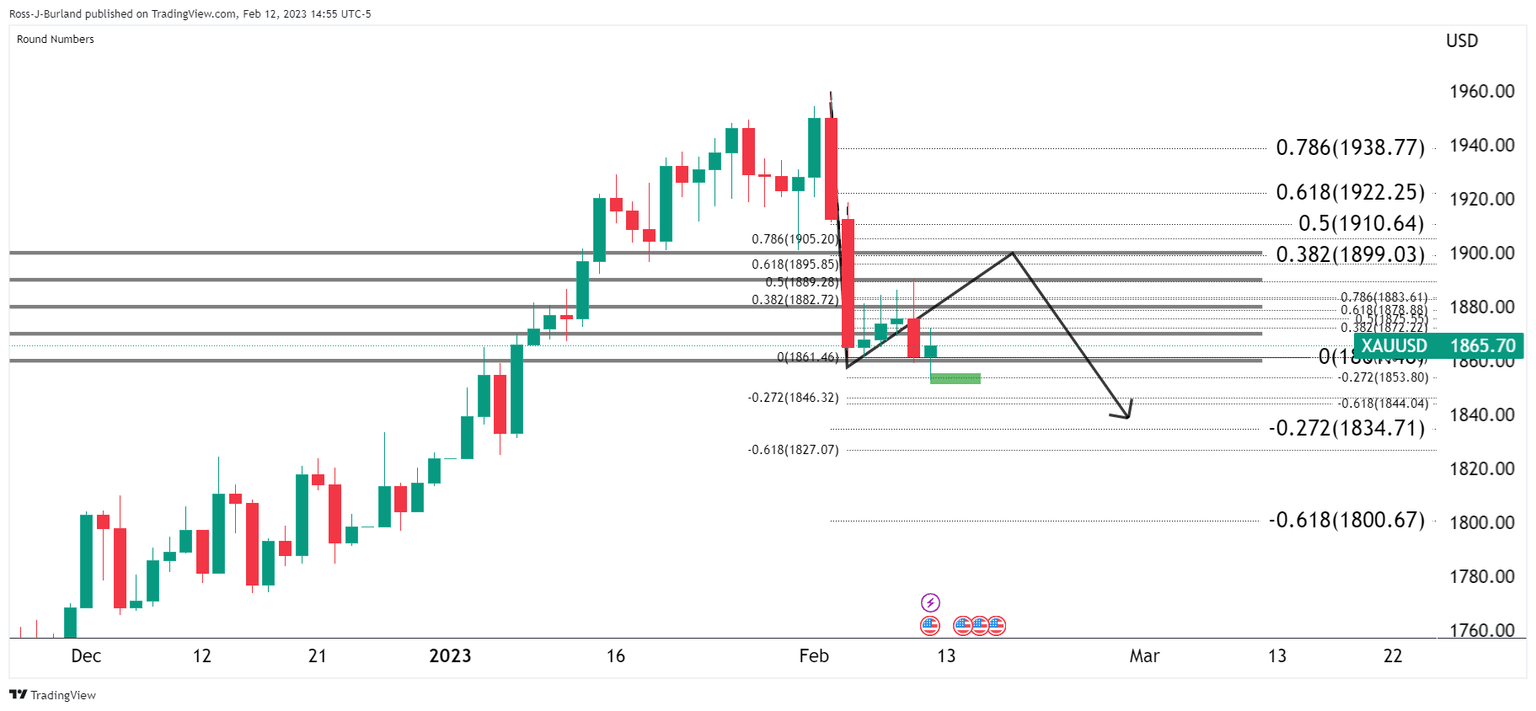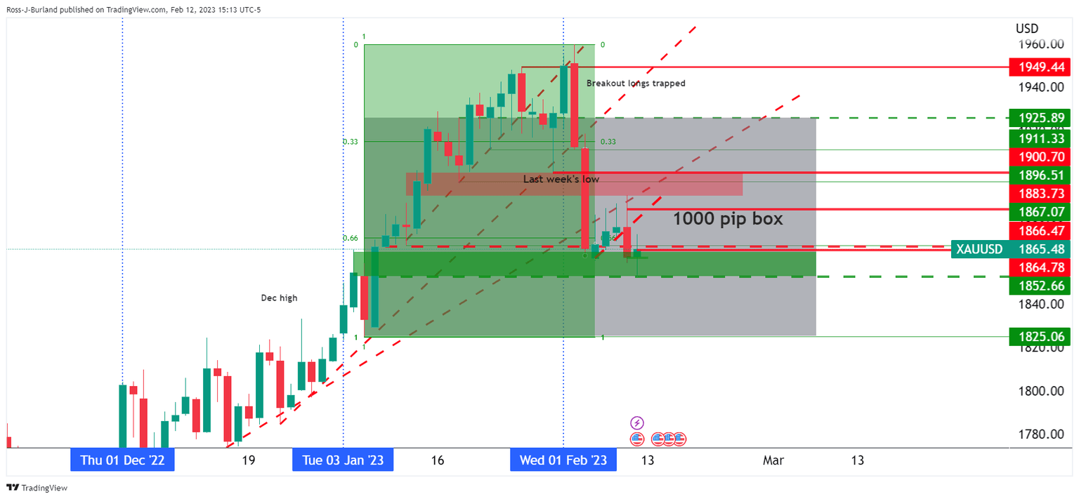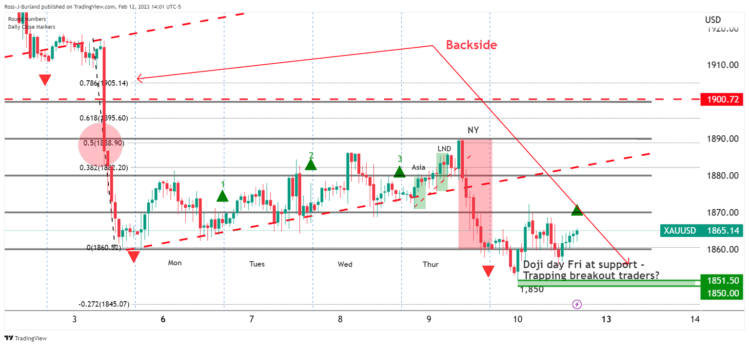 Eventually, and not necessarily this week as it depends on how much of a squeeze the bulls can put onto the shorts, the bears will need to get below $1,850 support for the low-hanging fruit en route towards the $1,825 target.