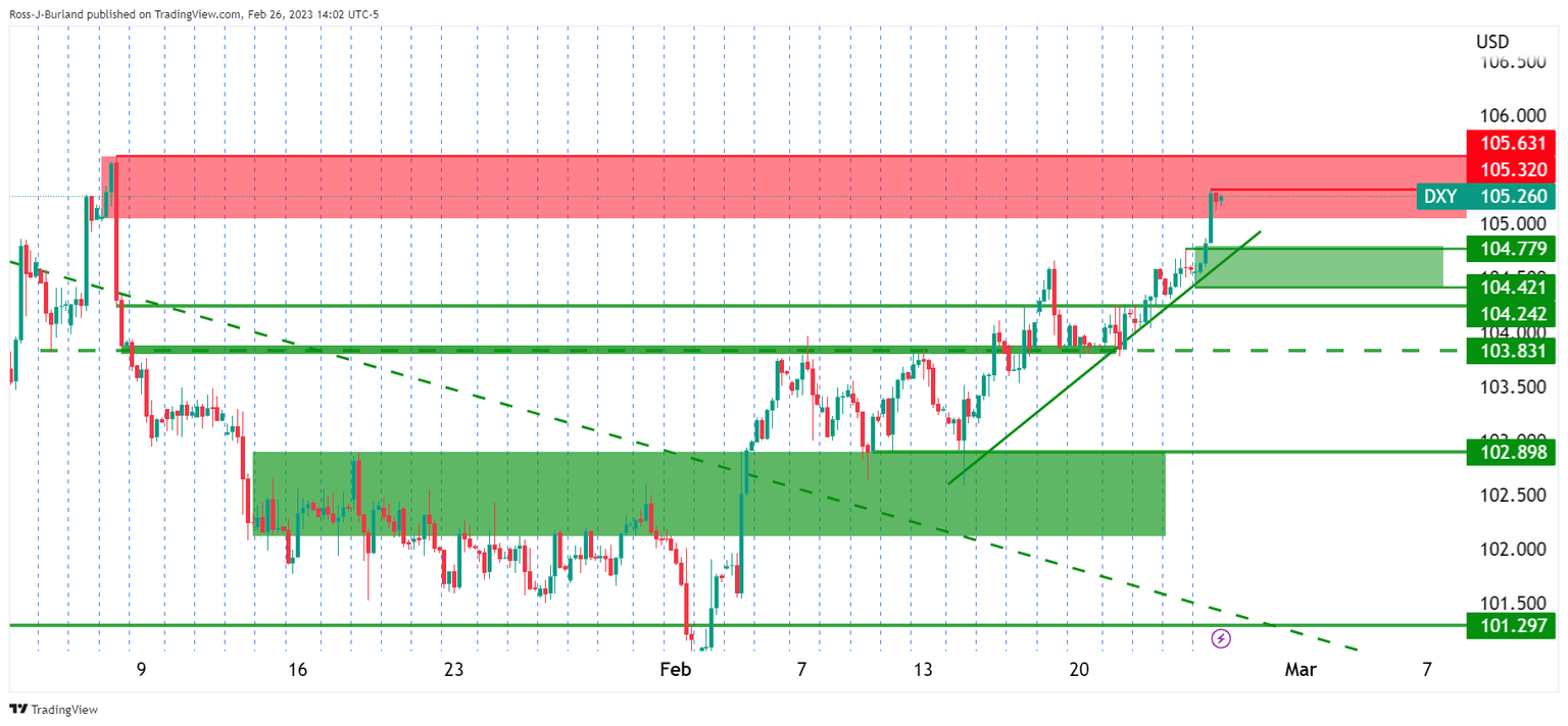 The US 10-year note yield reached a high of 3.978% and ended the day paying 3.947%, up from the day's low of 3.854%. The US Dollar index reached a high of 105.32 and ended the day up high after Personal Consumption Expenditures (PCE) Price Index, the Federal Reserve's preferred inflation measure, rose by an annualized 5.4% in January, up from 5.3% in December and ahead of a 4.9% consensus estimate.