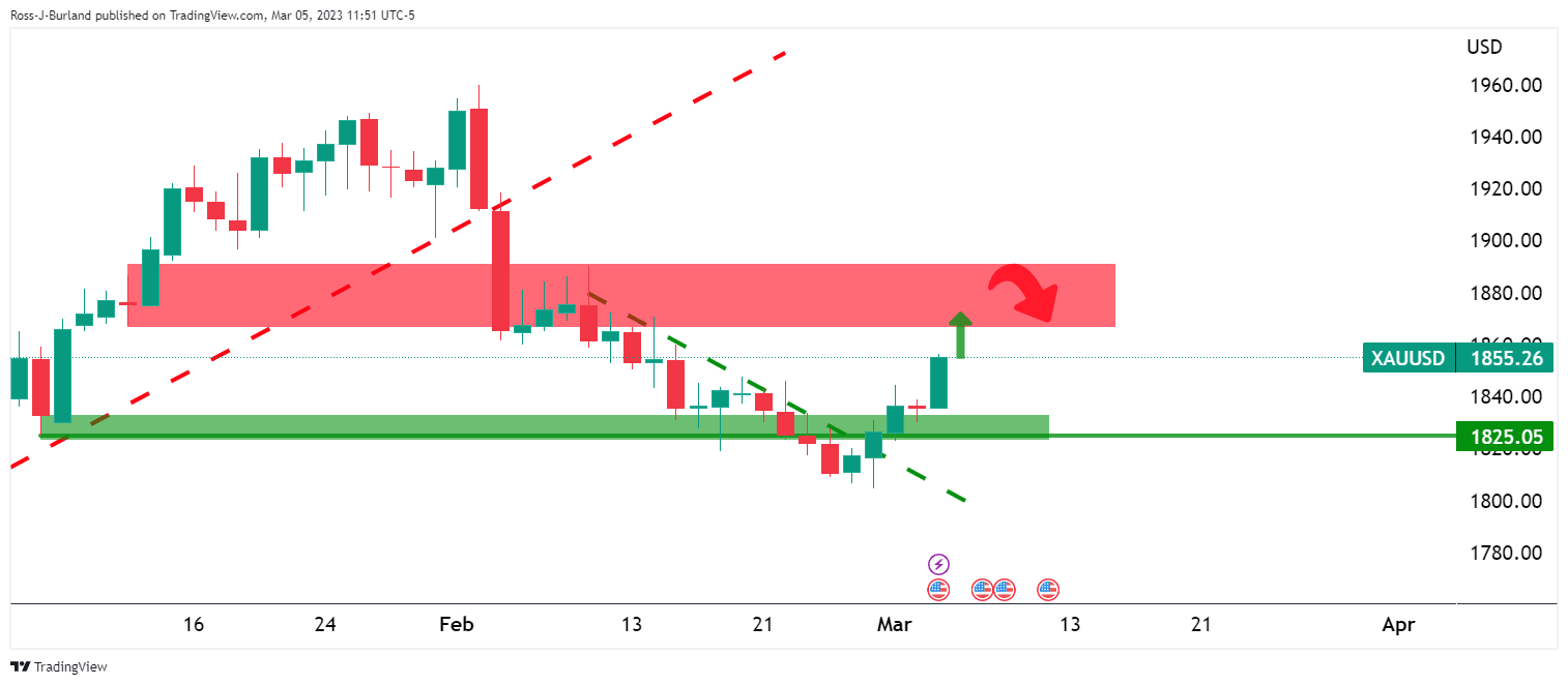 The US Dollar's bounce in February weighed on gold, but the bulls have been relieved of these pressures earlier in the month as the US Dollar Index ended with its first weekly loss in five. The charts below point to a temporary bullish phase as we head into the Federal Reserve's Chair Jerome Powell who will testify Wednesday on monetary policy to the House Financial Services Committee. However, if chair Powell voices hawkish rhetoric, gold could see this week's rally evaporate, especially should Nonfarm Payrolls give us another blockbuster.