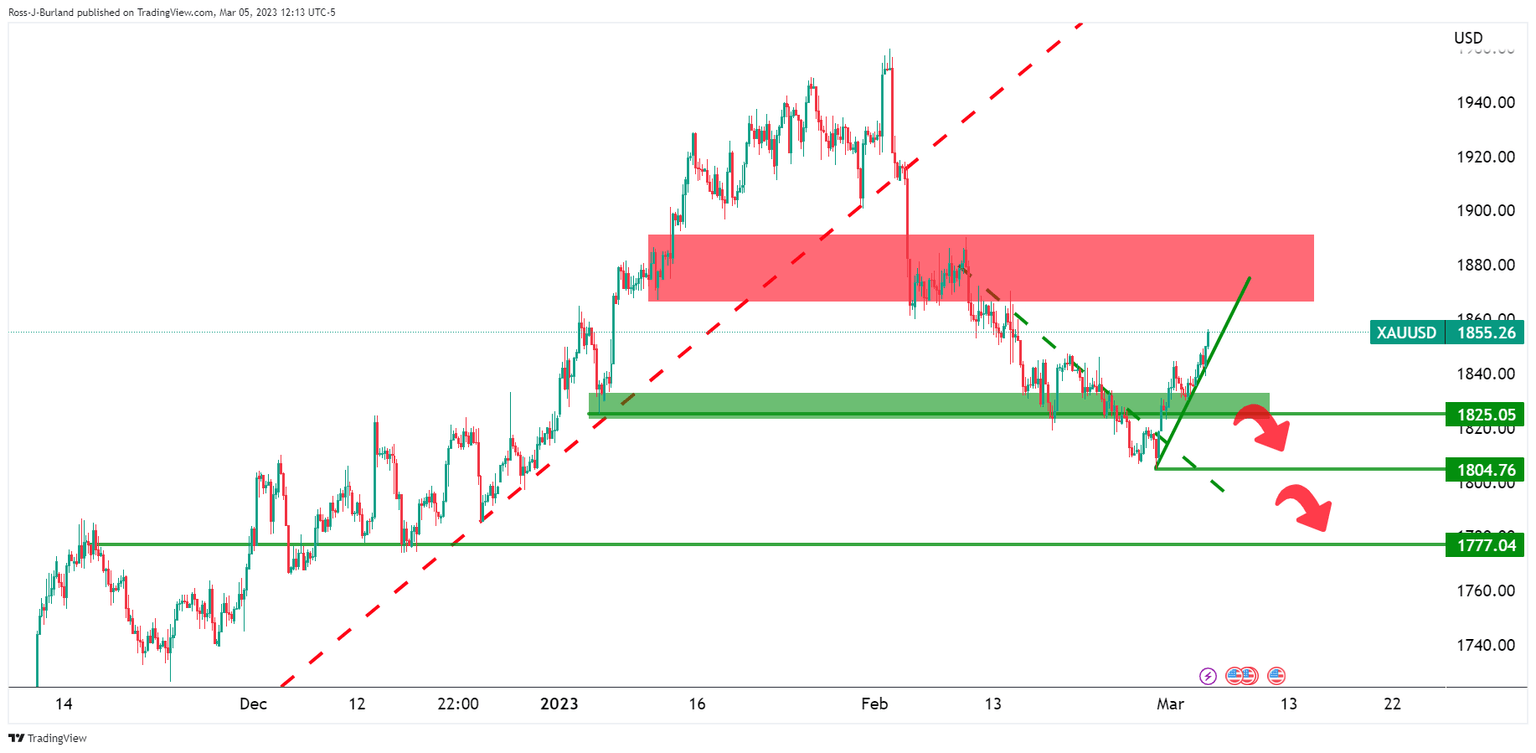 The 4-hour chart shows that the Gold price is riding dynamic support that would be expected to hold initial tests but a break thereof opens the risk of a move to test the $1,825 all-important support structure. A break there will most probably see a flurry of orders triggered and a fast subsequent move lower.