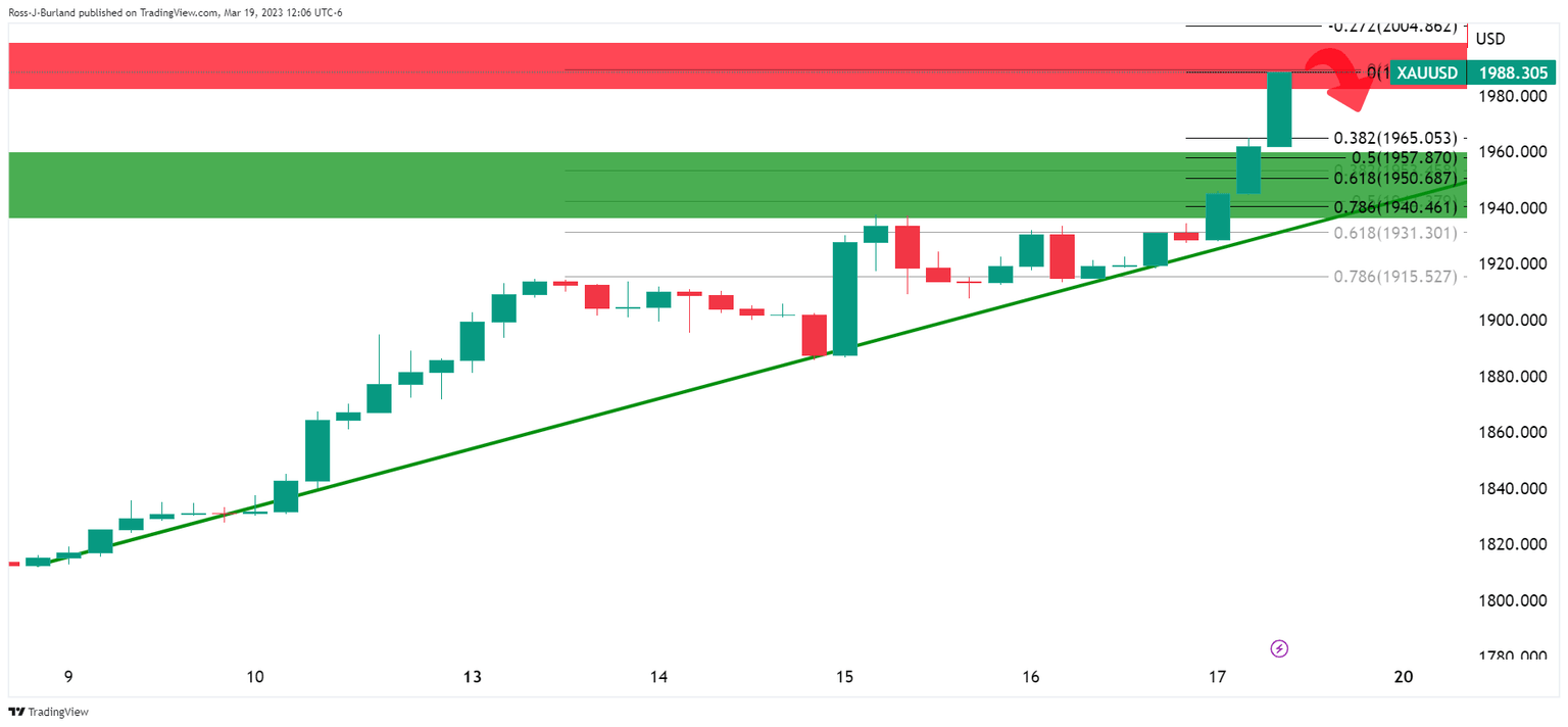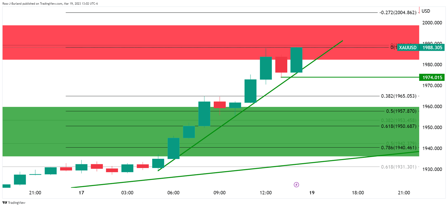 Analysts at TD Securities explained that bank liquidity concerns will constrain central banks' war on inflation, which in turn would breathe life into investment flows. ´´The bar is low for additional trend follower purchases to ensue as prices continue to rally into the FOMC. Subsequent buying activity is likely to ensue above the $1,985 and $1,995 marks, which could see algos add more than +8% of their max size,´´ the analysts argued.