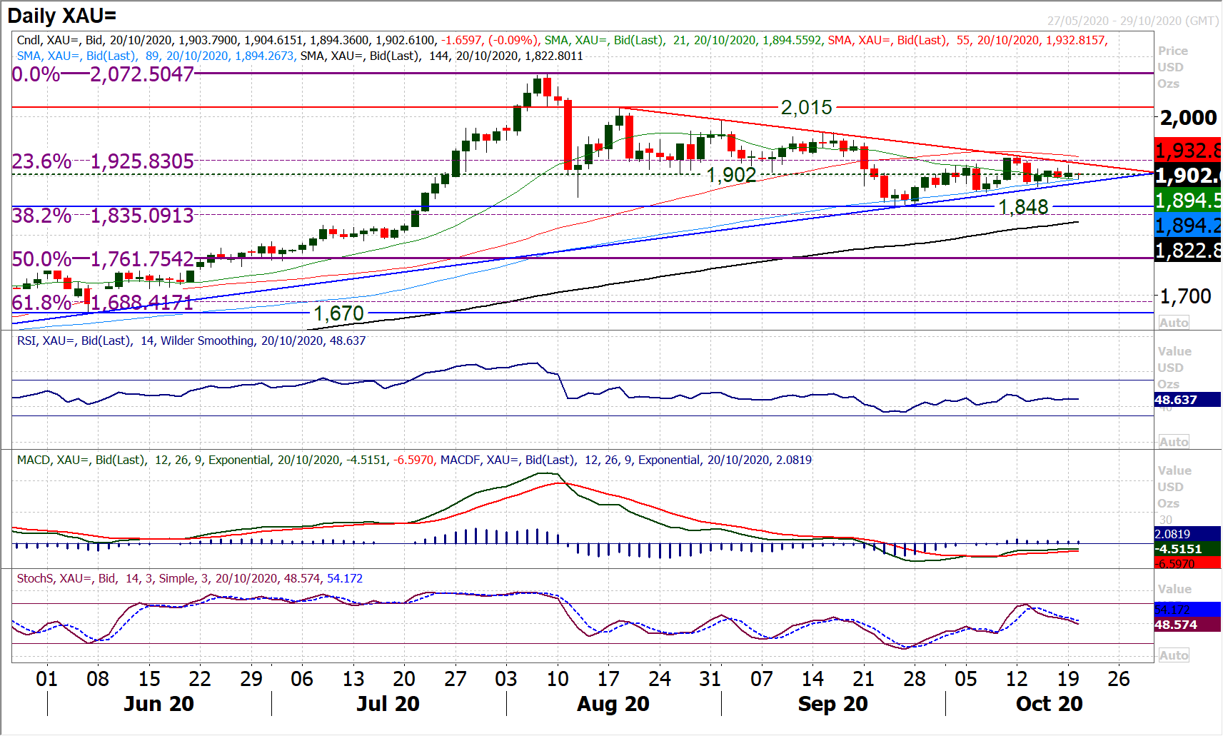 The consolidation continues. As the two big trendlines continue to converge but right now, it would appear that the market is unwilling to take a view on gold. The support of the six month uptrend rises at $1888 today, whilst the two month downtrend falls at $1922. It is of little real surprise that the price seems to be gravitating once more around the $1900 area, with the pivot/resistance band between $1902/$1933 a barrier to renewed upside. Within this, momentum indicators are extremely neutral and lack conviction. The daily RSI continues to hover a shade below 50, whilst MACD lines are flat just under the zero line (i.e. neutral). With a run of small bodied candles (lacking conviction) and the high/low range of the last three sessions all less than the Average True Range of $26, this is definitely a market in “wait and see” mode. A close below $1882 would begin to generate downside momentum (confirmed below $1873 support). A close above $1933 would generate positive momentum. For now though, as with several major markets, it is a waiting game (likely to be for fiscal stimulus and or the US Presidential election).