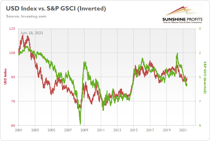 Why is the behavior of the S&P GSCI so important? Well, if you analyze the chart below, you can see that the S&P GSCI’s pain is often the USD Index’s gain.