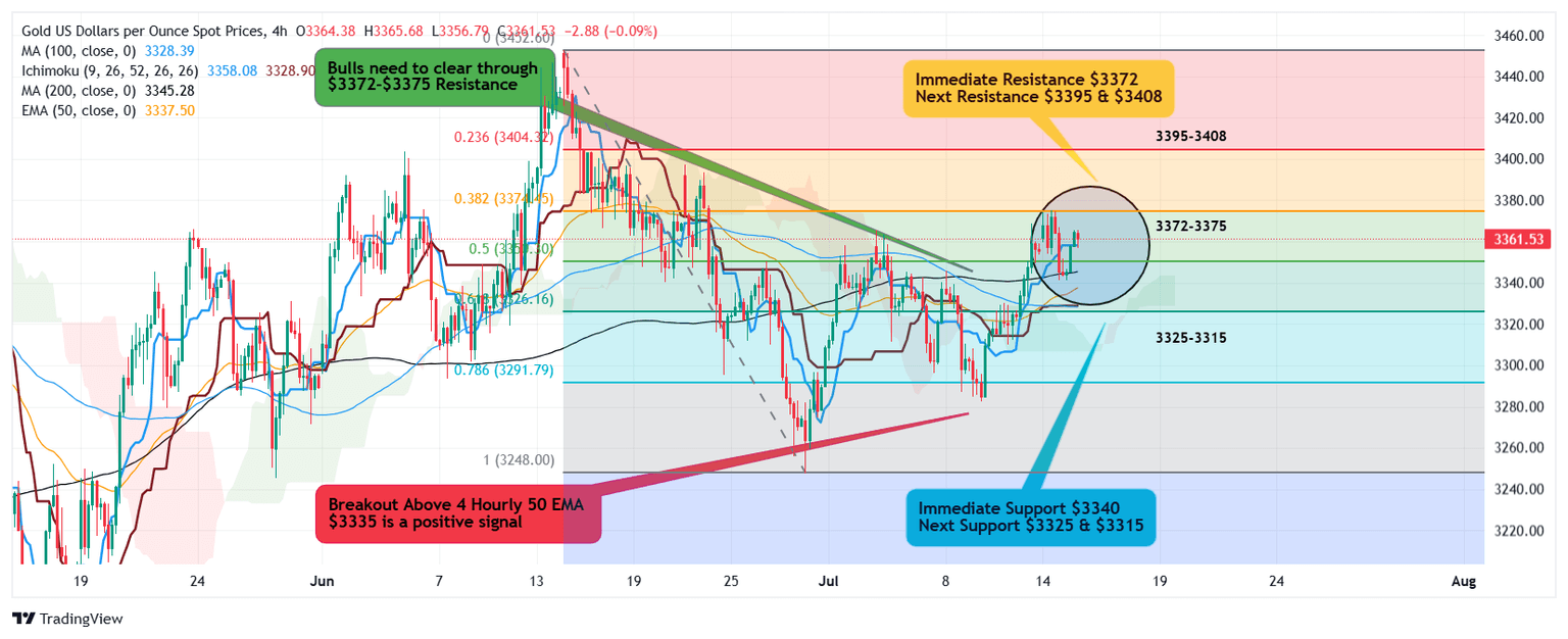 The wave structure clearly shows rebound attempts as current bullish momentum supported by price stability above 4 hourly 50 EMA $3335 and recent decline found buyers at $3341 which shaped the recovery to $3365 with London opening.
