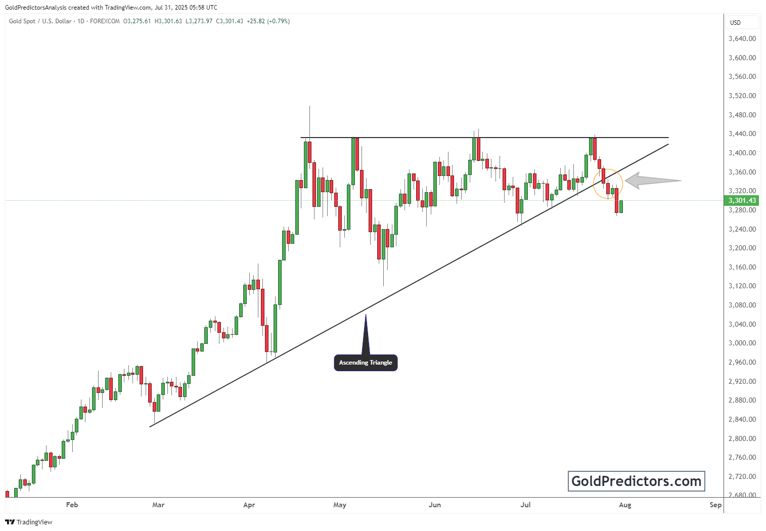 The gold chart below shows a clear ascending triangle pattern that developed over several months. This bullish formation featured rising lows and a horizontal resistance near $3,440. Gold repeatedly tested the upper boundary but failed to break out. However, the recent breakdown below the ascending trendline marks a bearish technical shift. A red circle and arrow highlight the breakdown point around $3,360. This invalidated the bullish structure and attracted fresh sellers.