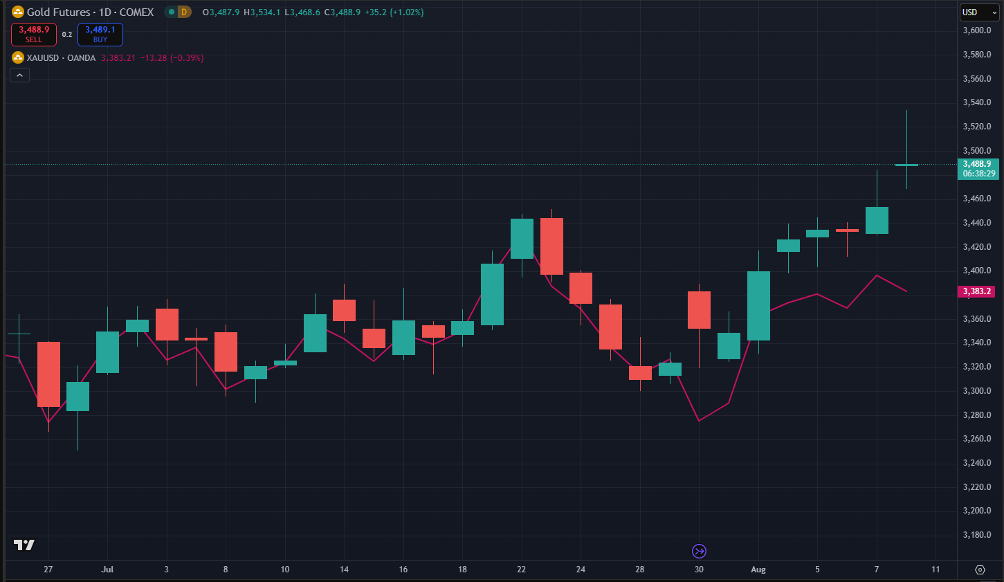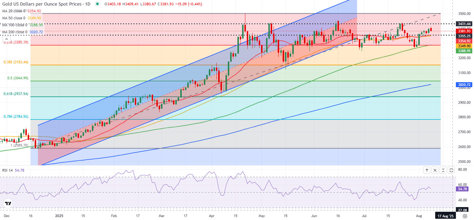 In the American session on Wednesday, safe-haven flows returned to markets as Trump announced new tariffs and delivered threats. Trump issued an executive order imposing an additional 25% tariff on Indian imports and said that he could impose an extra 25% tariff on Chinese goods over China's purchases of Russian Oil. Additionally, he noted that he might impose a 100% tariff on semiconductors and chips not built in the US, and threatened an extra 15% tariff on all Japanese imports. Gold benefited from risk aversion and climbed to the $3,400 area in the European session on Thursday.