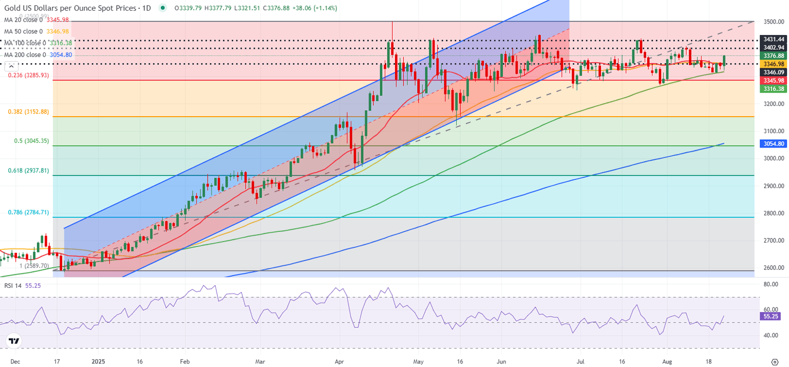 Gold remained under modest bearish pressure in the first half of the day on Friday but made a sharp U-turn in the American session to climb above $3,370. While speaking at the annual Jackson Hole Symposium, Fed Chair Jerome Powell announced that they will adopt a new policy framework of flexible inflation targeting and eliminate 'makeup' strategy for inflation. Additionally, Powell said that downside risks to the labor market were rising, while noting that it would be reasonable to expect that inflation effects of tariffs will be short-lived. These comments weighed on the USD and caused US T-bond yields to turn south heading into the weekend, fuelling a late rally in XAU/USD.