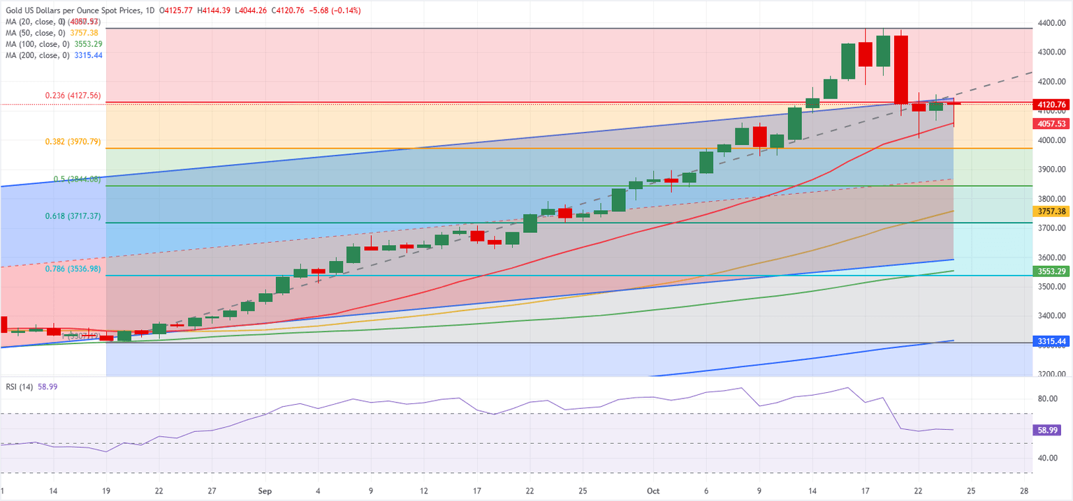 Gold’s correction extended into the Asian session on Wednesday and XAU/USD touched its lowest level in over a week at $4,004. Following that sharp decline, Gold managed to find a foothold as market participants assessed fresh US-China trade war headlines.