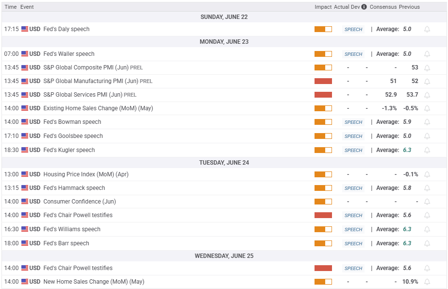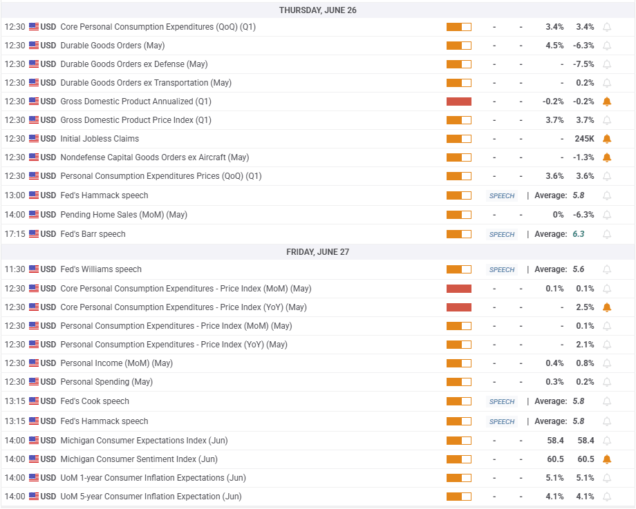 The US economic calendar will feature Personal Consumption Expenditures (PCE) Price Index data for May on Friday. In the post-meeting press conference, Powell said they estimate PCE and core PCE inflation to stand at 2.3% and 2.6%, respectively, in May. Although this comment takes away the surprise factor, a smaller-than-expected increase in the monthly core PCE Price Index reading could still hurt the USD in the near term.