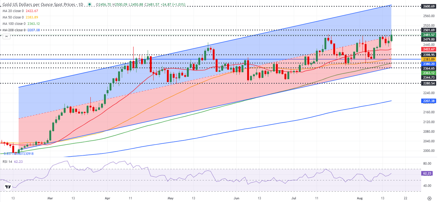 Gold (XAU/USD) reached a new record high of $2,500 despite struggling to gather bullish momentum in the first half of the week. Macroeconomic data releases from the US and Federal Reserve (Fed) Chairman Jerome Powell’s speech at the Jackson Hole Symposium next week could trigger the next big action in Gold.