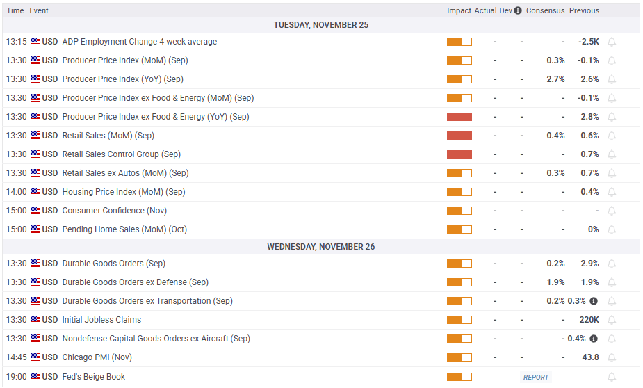 Investors will pay close attention to comments from Fed policymakers before the blackout period starts on November 29. The market positioning suggests that there is room for additional USD strength in case Fed officials continue to voice their opposition against a rate cut in December. Conversely, Gold could gain traction if policymakers emphasize worsening labor market conditions and argue for another rate cut at the last policy meeting of the year.