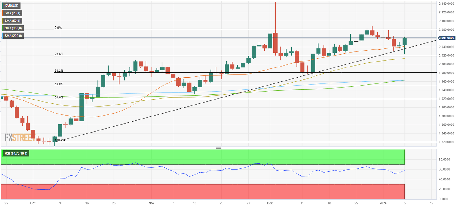 The monthly data published by the US Bureau of Labor Statistics showed on Friday that Nonfarm Payrolls (NFP) rose by 216,000 in December, surpassing the market expectation for an increase of 170,000. On a concerning note, the previous two NFP readings were revised lower by a total of 71,000. The Unemployment Rate held steady at 3.7% in the same period, but the Labor Force Participation Rate fell to 62.5% from 62.8% in November. Although the initial reaction provided a boost to the USD, underlying details of the jobs report didn’t allow the currency to preserve its strength. In turn, XAU/USD recovered back above $2,050 after falling below $2,030 with the immediate reaction. Finally, the ISM Services PMI declined to 50.6 in December from 52.7 in November, putting additional weight on the USD's shoulders.