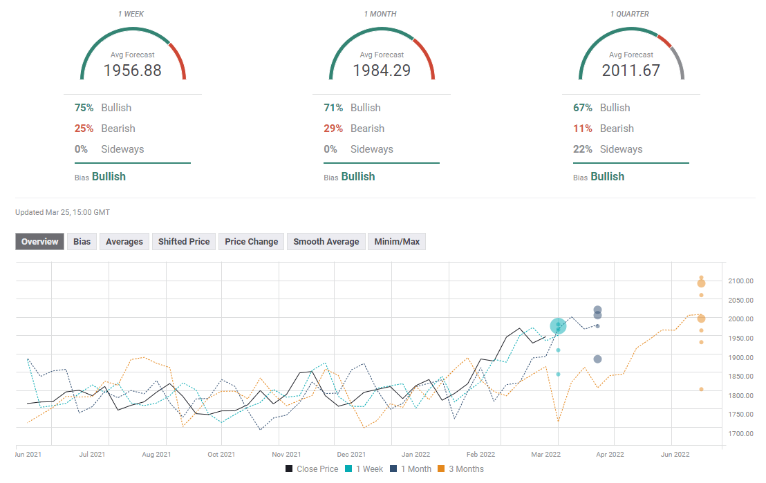 There is an apparent bullish tilt in the FXStreet Forecast poll. The majority of the polled experts see gold rising in the one-week and one-month time frames with average targets of $1,956 and $1,984, respectively.