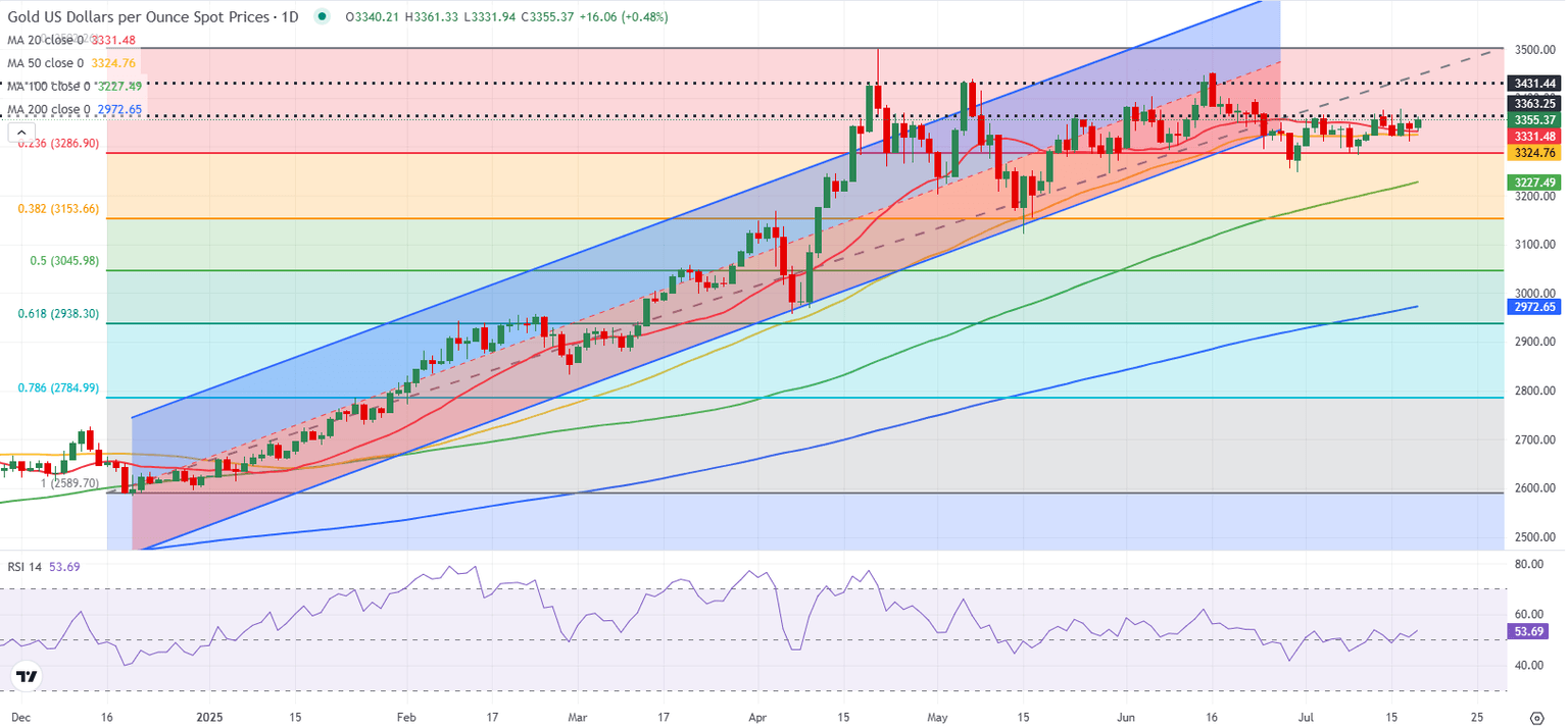 After stabilizing in the European session on Wednesday, Gold benefited from falling US Treasury bond yields and registered daily gains. Citing multiple sources with direct knowledge of the matter, CBS News reported that US President Donald Trump asked Republican lawmakers whether he should fire Fed Chairman Jerome Powell. This headline weighed on the USD and caused US T-bond yields to turn south. Meanwhile, the data from the US showed that the Producer Price Index (PPI) rose by 2.3% on a yearly basis in June. This reading followed the 2.6% increase recorded in May and came in below the market expectation of 2.5%.