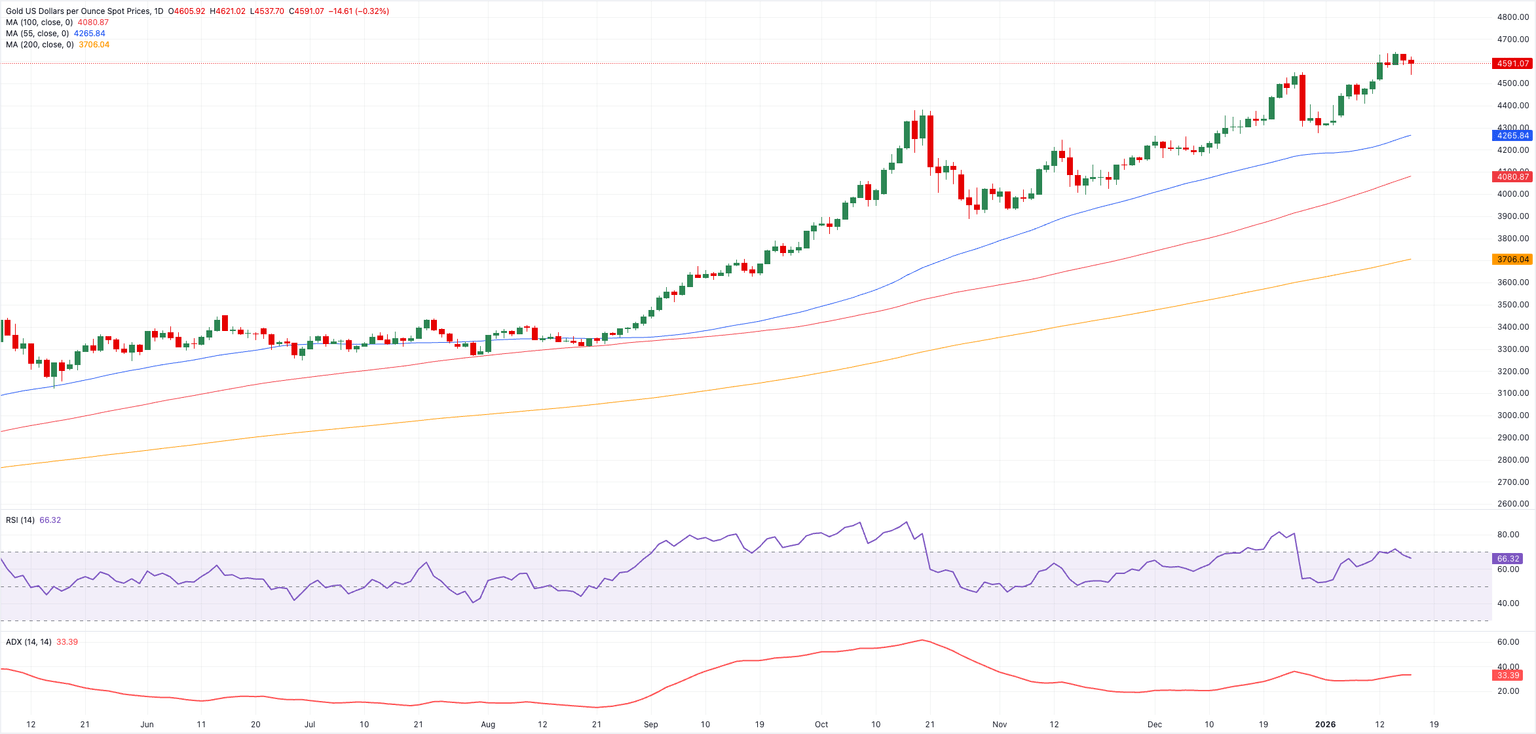 On the downside, immediate support emerges at the weekly trough at $4,274 (December 31), an area reinforced by the provisional 55-day SMA at $4,259. Down from here sits the December floor at $4,163 (December 2), ahead of the transitory 100-day SMA at $4,071.