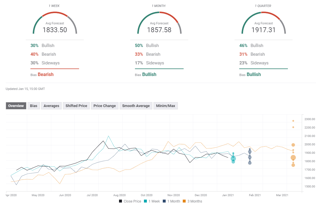 According to the FXStreet Forecast Poll, 40% of experts see XAU/USD staying under pressure in the near-term. Following this week's price action, a bearish shift could also be seen on the one-month view, which now has an average target of $1,857 compared to $1,893 last week.