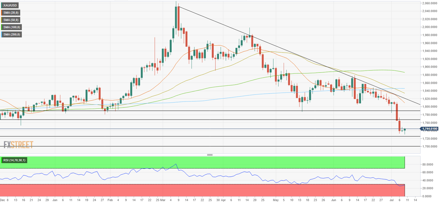 On the upside, $1,765 (former support, static level) aligns as first technical resistance ahead of $1,790 (former support, static level). A daily close above the latter could open the door for an extended recovery toward $1,800, where the descending trend line coming from early March and the 20-day SMA is located. As long as this level stays intact, however, sellers are likely to dominate the pair's action following the correction.