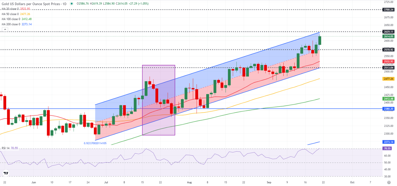 On Wednesday, the Fed announced that it lowered the policy rate by 50 bps to the range of 4.75%-5%. Ahead of the event, the CME FedWatch Tool was showing that there was about 40% probability of the Fed opting for a 25 bps cut. Hence, the immediate market reaction triggered a USD sell-off. In turn, Gold gathered bullish momentum and reached a new record high of $2,600. Meanwhile, the revised Summary of Economic Projections (SEP) showed that policymakers were forecasting a total of another 50 bps rate reduction in the remaining two policy meetings of the year.