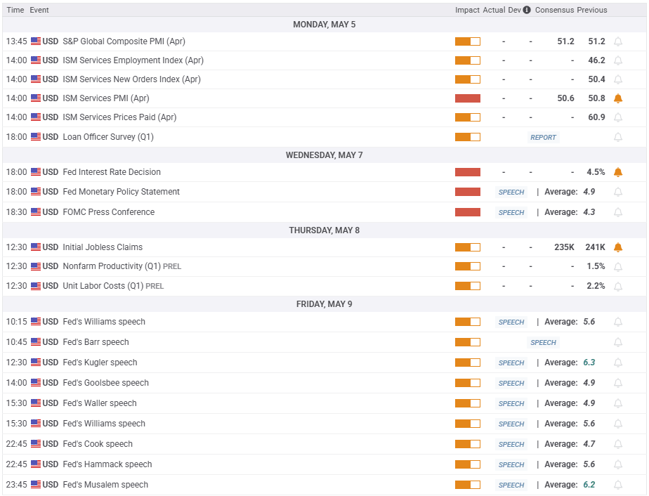 The Fed is widely anticipated to leave the interest rate unchanged at the range of 4.25%-4.5% after the May 6-7 policy meeting. Market participants will scrutinize changes in the policy statement and pay close attention to comments from Fed Chairman Jerome Powell in the post-meeting press conference.